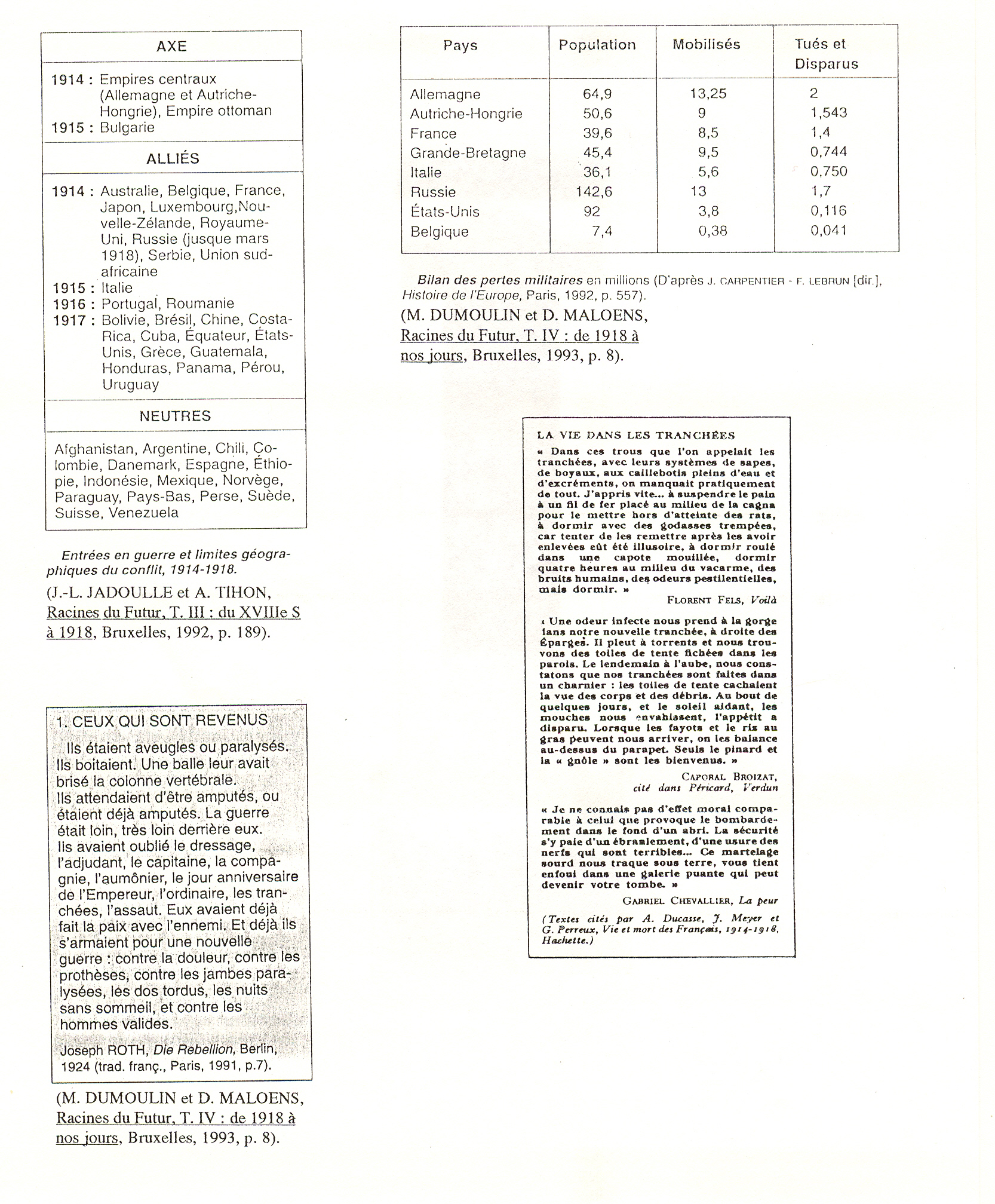 * Document concernant l'indemnisation d'un blessé et invalidede guerre français + extrait d'un ouvrage de Joseph Roth Français (Ph. Plumet - Don Bosco / Belgique) * Place des femmes Français (C. Saive-Léonie de Waha / Belgique) * Les invalides Français (M. Tyssens -Ste Véronique / Belgique) * Août 1914 : invasion de laBelgique : Documents pour servir à l'histoire de l'invasionallemande * Consecinţe de la Grande Guerre : déclin de la bourgeoisie Français (Cliotexte / Suisse)